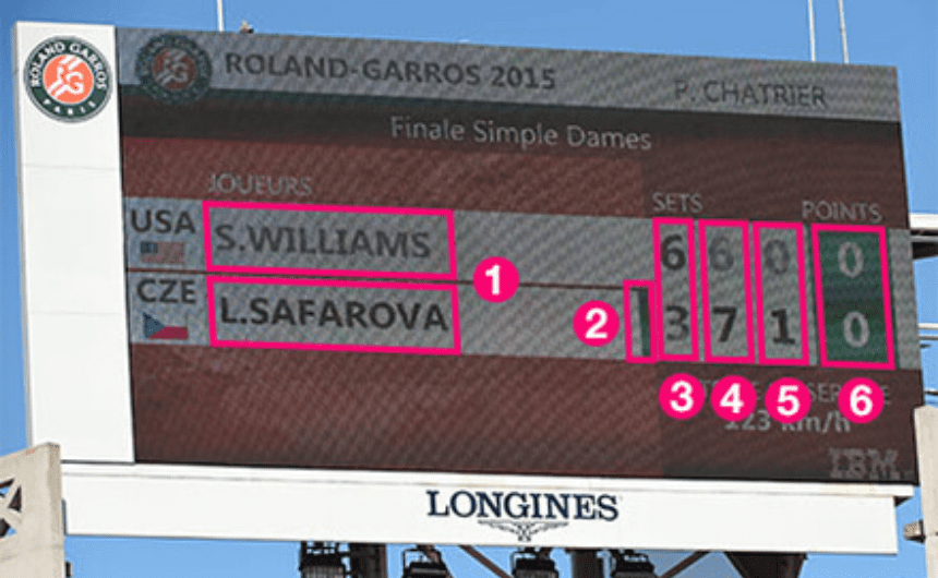 ※サービスをしている選手を表す表示。電光掲示板の種類によって表示のされ方は違うが、このように一目で見てわかるようになっている